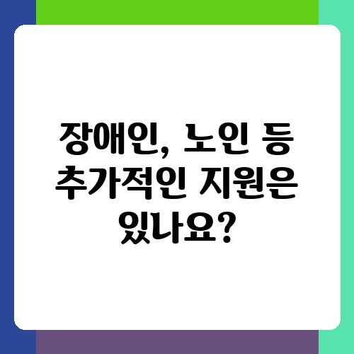 장애인이나 노인 등 특정 취약계층에 속하는 의료급여 수급자분들은 추가적인 지원을 받으실 수 있습니다. 예를 들어, 장애인의 경우 장애 정도에 따라 추가적인 의료비 지원이나 재활 치료 지원을 받을 수 있으며, 노인의 경우 노인 요양 시설 이용에 대한 지원을 받을 수 있습니다. 이러한 지원 혜택에 대한 자세한 정보는 지역 사회복지센터나 보건소 등에서 확인할 수 있습니다. 자신의 상황에 맞는 지원 혜택을 찾아 적극적으로 활용하시길 바랍니다. 알고 보면 도움받을 수 있는 제도들이 많으니 망설이지 마시고 문의하세요.